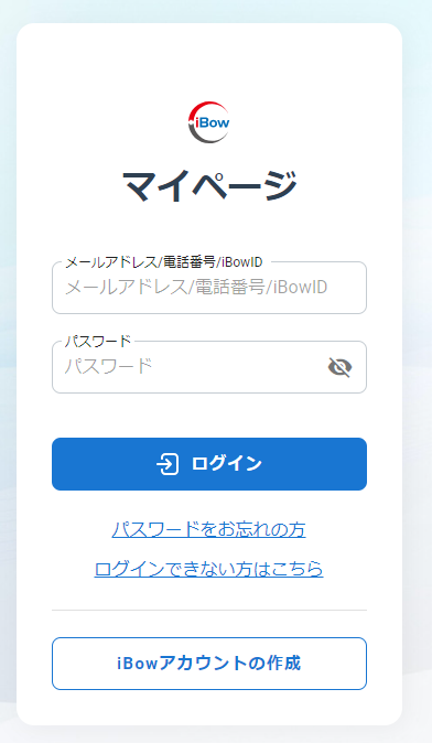 マイページ“https://auth.ibowservice.jp/”から、メールアドレス・携帯電話番号でログインを行ってください。