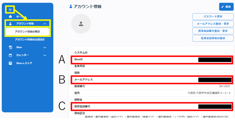 なお、招待には、マイページにログイン後確認できる、「iBowID」「メールアドレス」「携帯電話番号」(下図ABC)いずれかの情報が必要です。